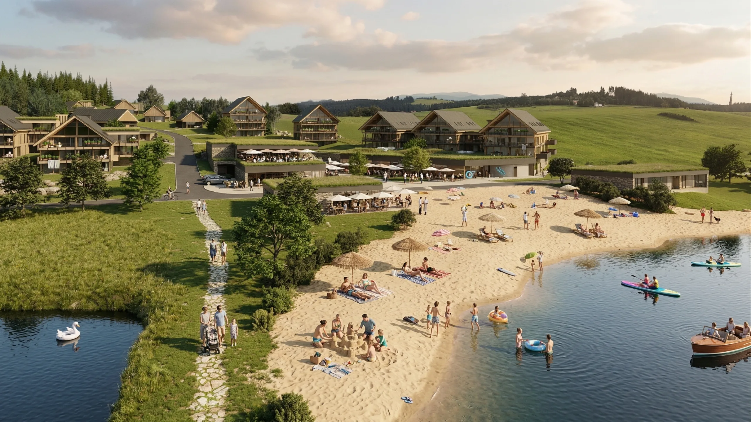 Zajít si do sauny, udělat pro děti táborák nebo promítnout film v letním kině, zaplavat si v biotopu nebo pozvat přátele na grilovačku - a to třeba každý den. Na to by byla potřeba hodně velká zahrada. V Resortu pod Brdy mají tuto možnost všichni, protože společný prostor přesně toto nabízí.