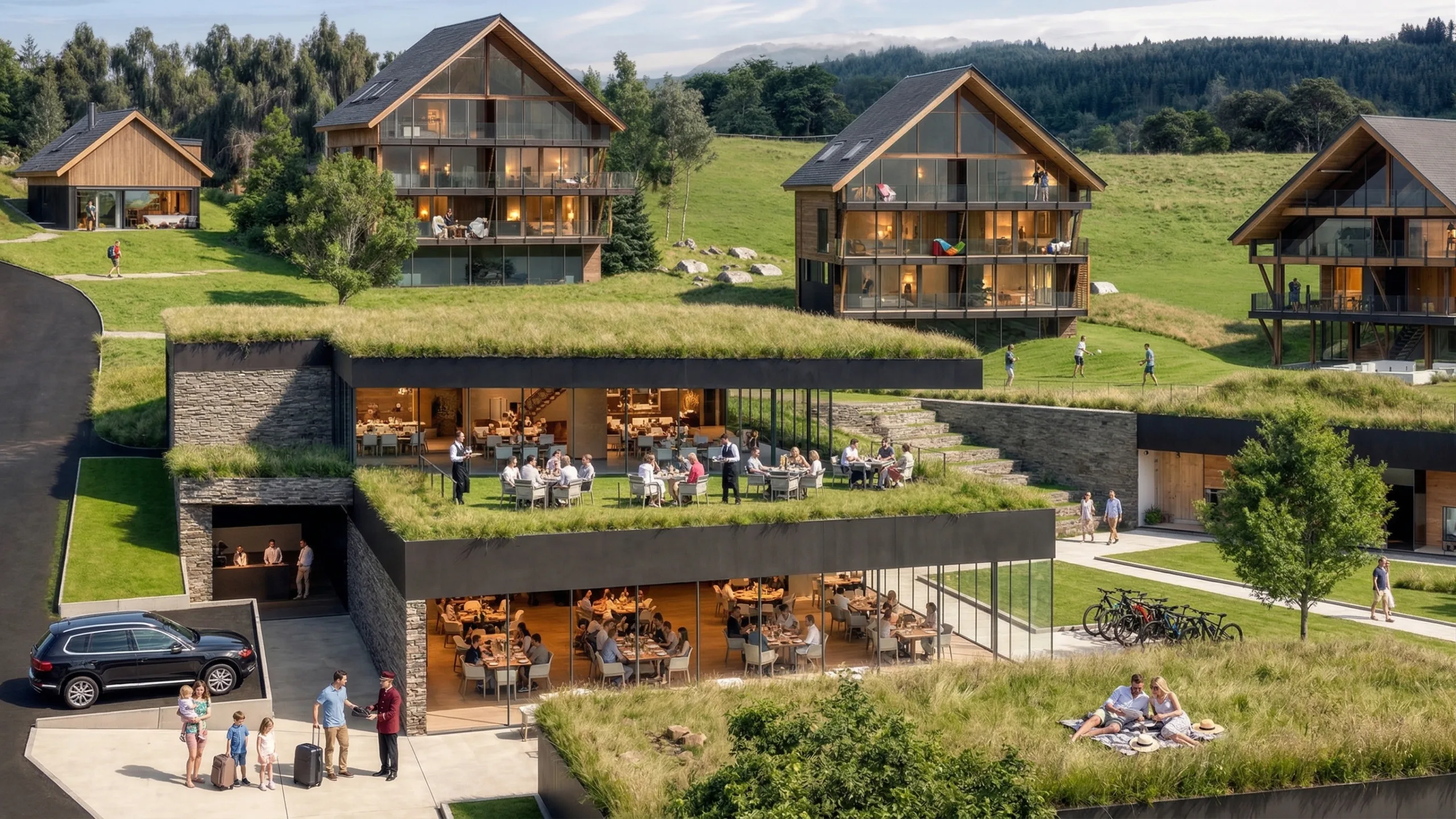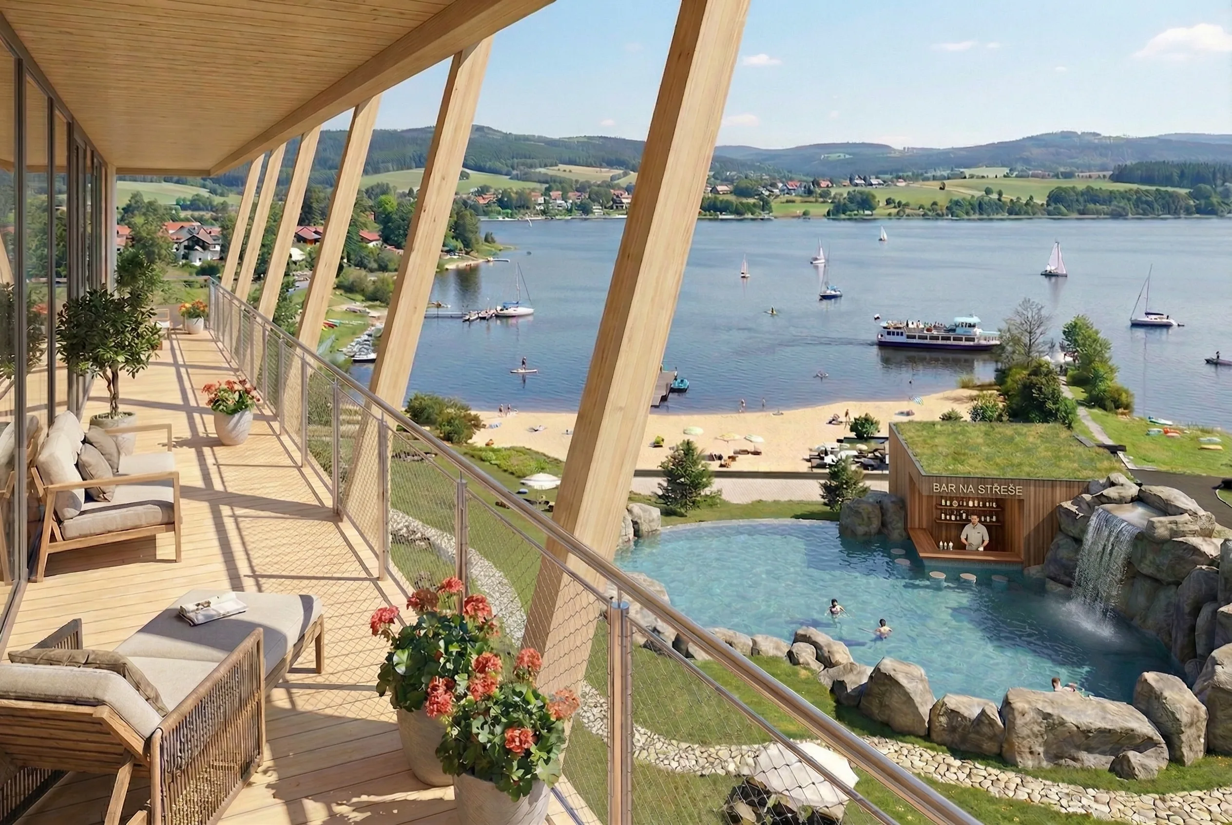 Areál je navržen pro ***** ubytování a služby a už při jeho plánování jsme se inspirovali těmi nejlepšími projekty v alpách i oblastech severoitalských jezer. Proto volbu operátora nechceme uspěchat a nevybíráme nejvyšší výnos, nýbrž největší zkušenosti.