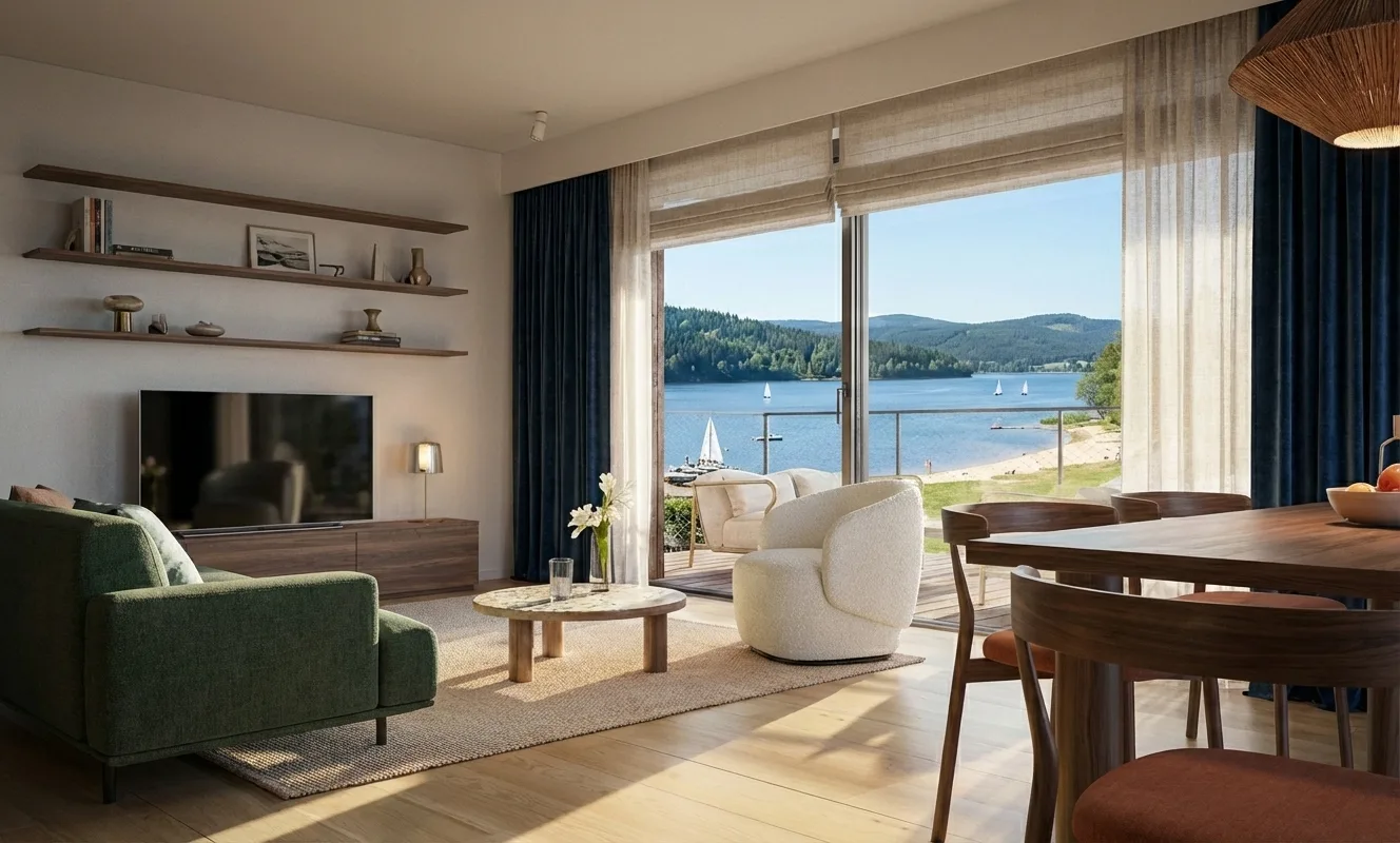 Lipenský resort nabízí exklusivní byty a chalety vybavené do nejmenšího detailu přímo na břehu přehrady jen 15 minut od Českého Krumlova